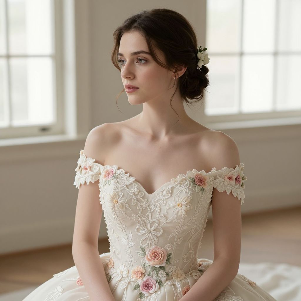 Photograph of a fair-skinned, young woman with dark brown, wavy hair in an updo adorned with small white flowers. She wears an off-the-shoulder, cream-colored wedding gown with intricate floral lace and pink rose embroidery. The gown has a fitted bodice and a full skirt. She gazes thoughtfully to the left with soft makeup and pink lips. The background features bright, blurred windows and light-colored walls, creating a serene, sunlit atmosphere. The image has a soft, romantic, and elegant feel.