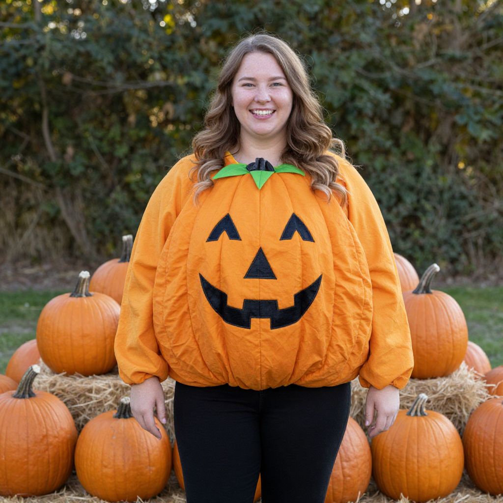 Plus Size Adult Pumpkin Costume, woman in a pumpkin costume standing in front of pumpkins