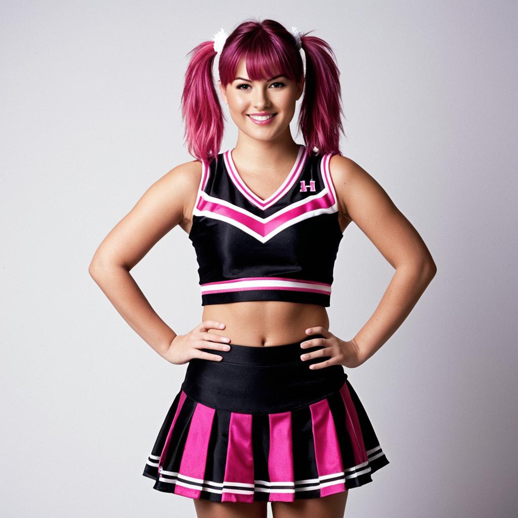 Pink black cheerleader ,solo, pink hair, 1girl, skirt, realistic, hands on own hips, cheerleader, smile