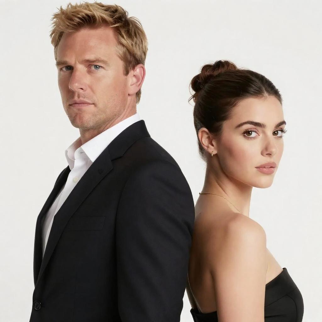 Close-up photograph of a blonde man wearing a light blue shirt and navy jacket standing behind a brunette woman with bangs, both with blue eyes and neutral to intense facial expressions. The background features a poster with black-and-white photos. The man is on the left and the woman is on the right in the frame.