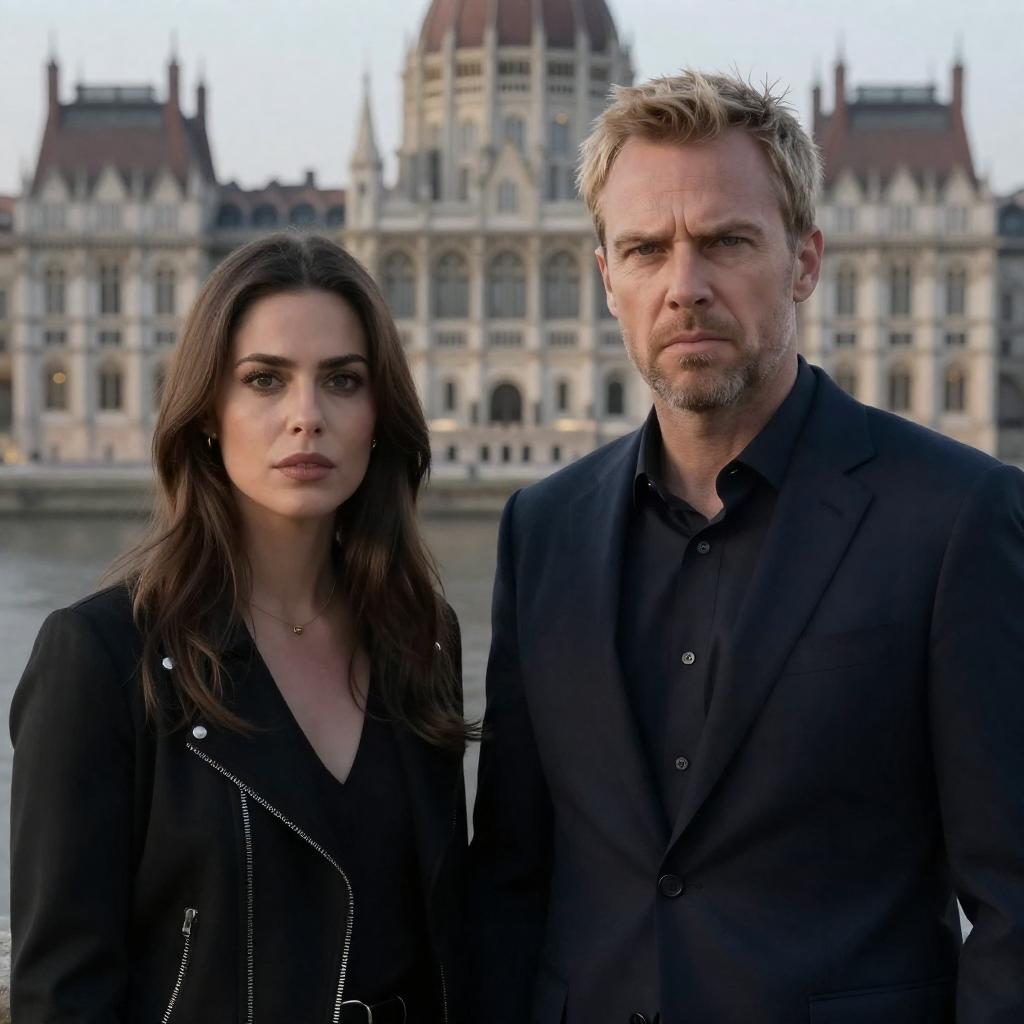 Photograph of two people. Blonde man with blue shirt and navy jacket, intense expression, standing behind brunette woman with bangs, blue eyes, and neutral expression. Background has poster with black-and-white photos. Man on left, woman on right.