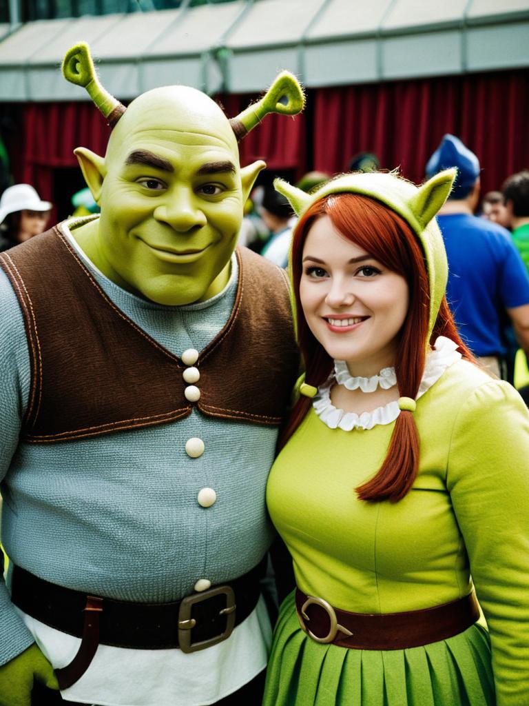 Couple in Shrek and Fiona Costumes, cosplay festival photo, photorealistic realism