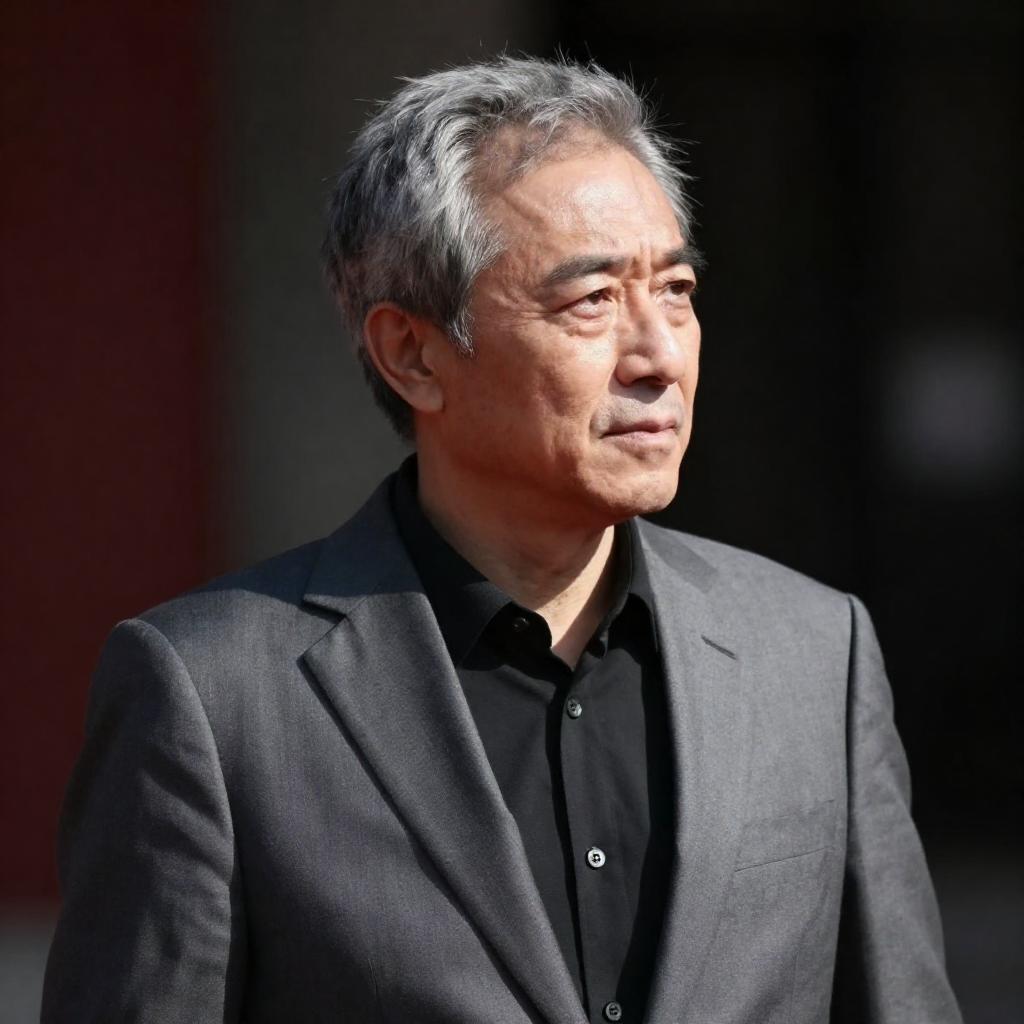 Photograph of a middle-aged man with gray hair and mustache, wearing a dark shirt, illuminated from the side, serious expression. Dark background with indistinct objects. Right side has a small, white box. One person.