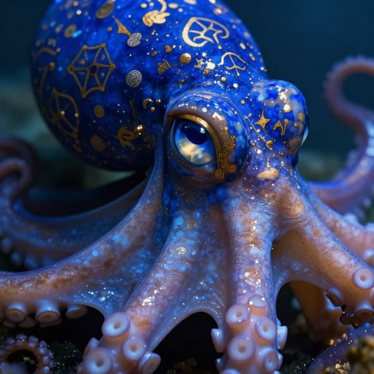 A close-up of an octopus with a lapislazuli blue and gold ringed eye, featuring mystical symbols and a powerful, angry expression, reflecting in the right eye, with cinematic lighting.