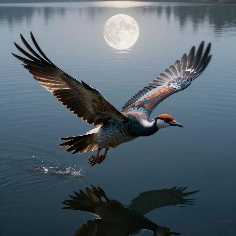 Envision a stunning digital artwork capturing a magnificent avian figure as it ascends from a peaceful lagoon during golden hour. The bird's vibrant plumage mirrors the water's surface, creating an enchanting display that harmoniously blends serenity and untamed power. Shot from a low viewpoint, this breathtaking scene highlights the creature against the soft, warm light of sunset, with elongated shadows across the tranquil landscape hinting at the transition from day to night in this captivating realm.