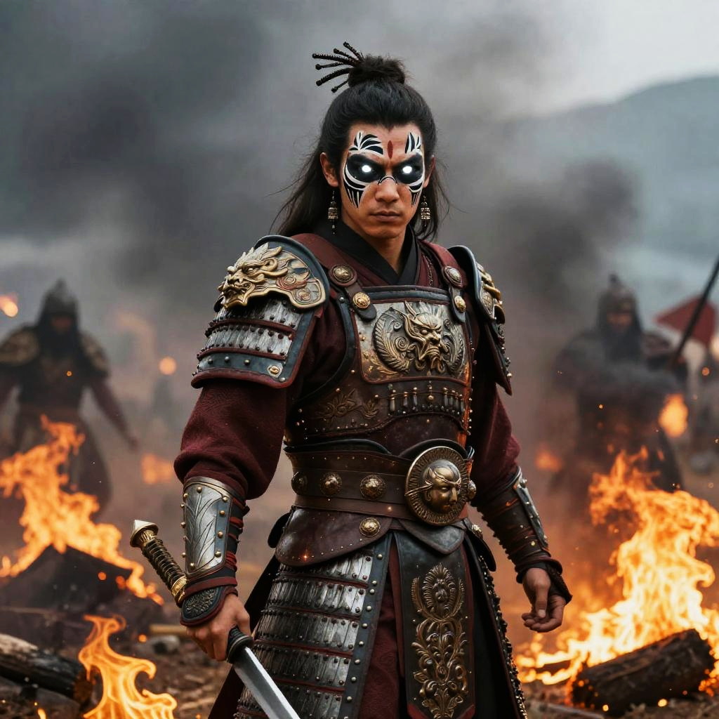 Blonde Mongolian warrior standing on a snowy mountain peak, traditional armor shimmering under the golden sunset, fierce expression, detailed landscape background, cinematic lighting