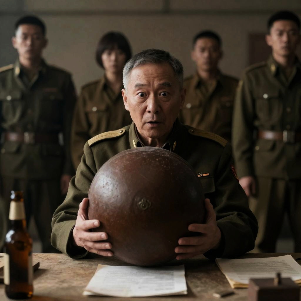 Old man in dark military uniform holds large, brown, round object. Table with papers and beer bottle in foreground. Background: four people, blurred, standing. Dark room. Man's expression: surprised. People's expressions: neutral. Tablecloth: beige.
