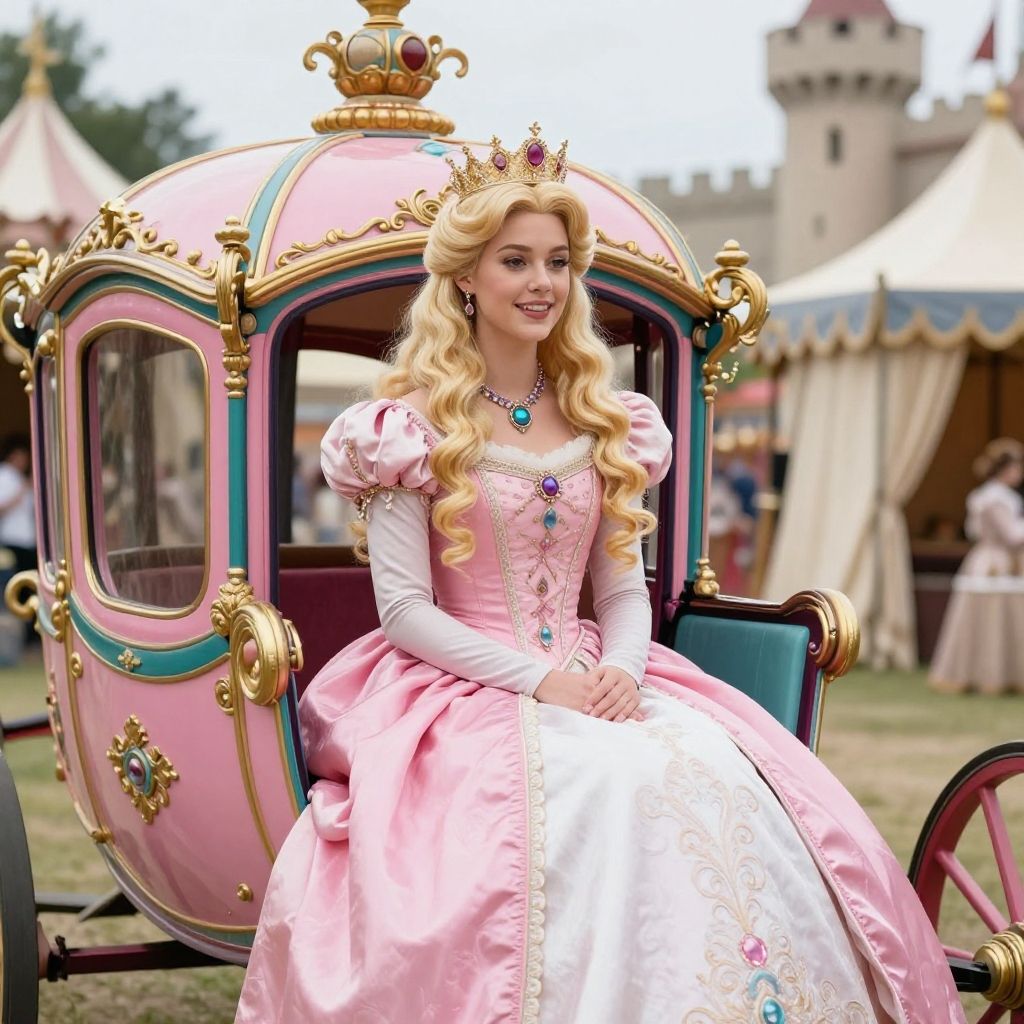A fantasy princess with long golden blonde curly hair wears a pink and white royal dress adorned with jewels. She is seated in an ornate pink and teal carriage with gold accents. The princess wears a jeweled necklace and a small golden crown. The background features a medieval fair setting with tents and castle turrets under soft, bright lighting.