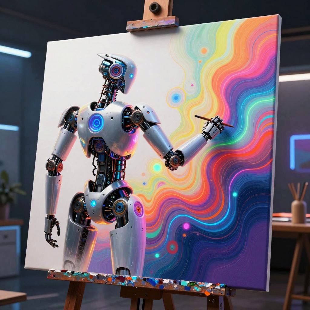 Draw AI art featuring a futuristic robotic painter creating vibrant abstract designs on a large canvas, glowing neon colors, digital brush strokes blending with organic shapes, high-tech studio environment, cyberpunk aesthetic with intricate details, 4k resolution.