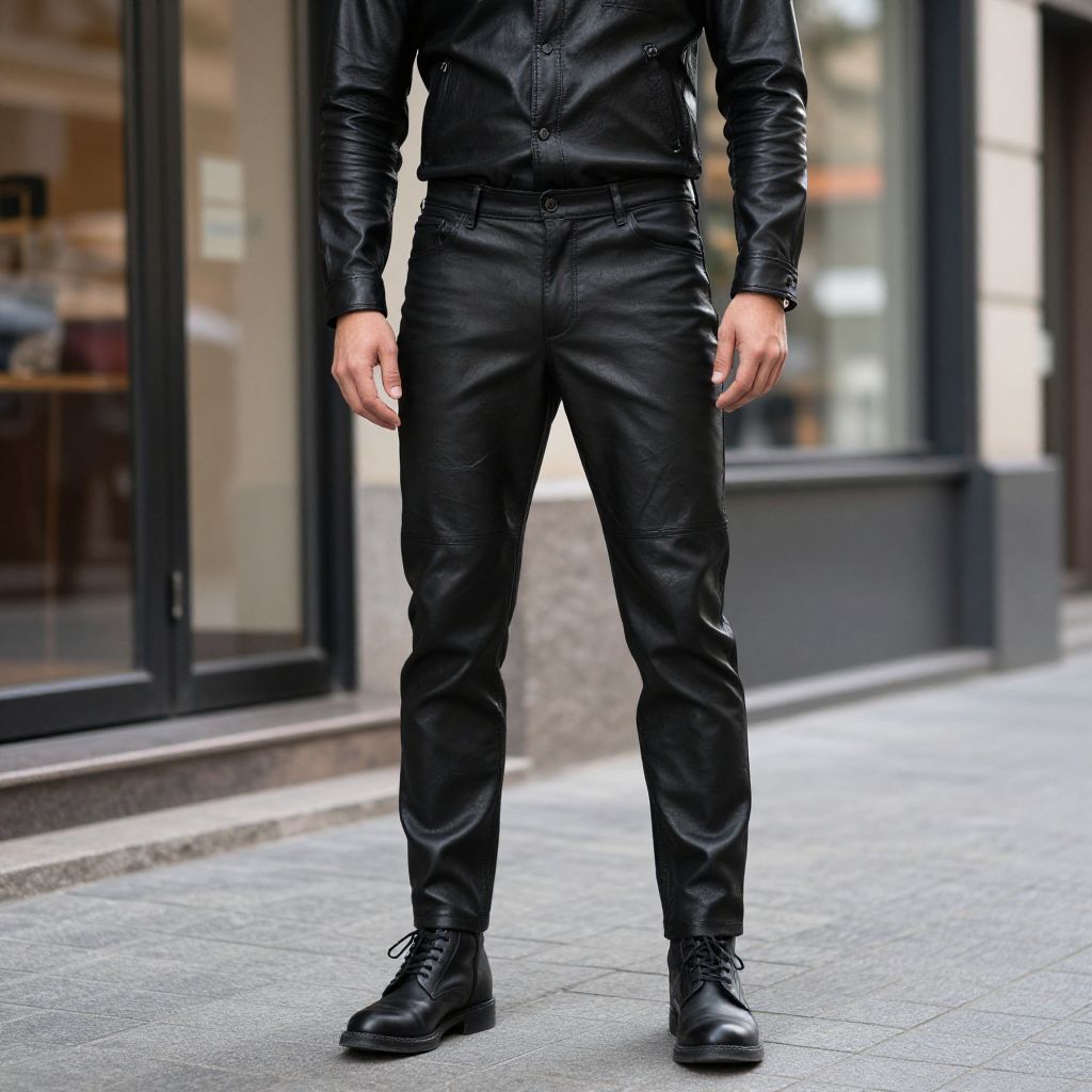 "Man Leather Pants, man in a leather shirt and leather pants standing in the street"