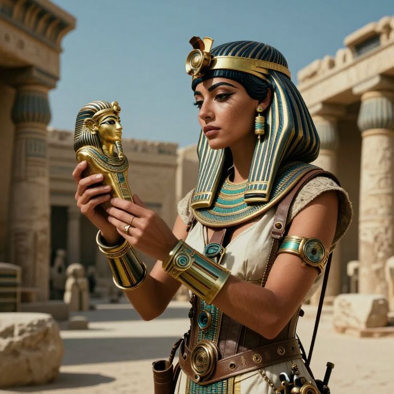 The image depicts a highly detailed and realistic illustration of a woman with striking features, reminiscent of Cleopatra. She is adorned in a Cleopatra-style dress with a fitted waist, featuring gold accents and intricate designs. Her hair is long, flowing, and black, cascading down her shoulders. She wears a headpiece with a turquoise gemstone, adding a regal touch to her appearance. Her makeup is smoky and bold, enhancing her eyes and lips. In her hand, she holds a ring, which is also detailed and appears to be made of gold. The background is a desert landscape, evocative of Conan the Barbarian, with rugged mountains and a warm, golden hue. The lighting is realistic and cinematic, with sunlight casting shadows and highlighting the textures of her clothing and the landscape. The overall composition is balanced, with the woman centrally positioned and the desert landscape providing a dramatic backdrop. The image is highly detailed, with a sharp focus on the woman's face and clothing, and is rendered in a style that combines realism with artistic flair.