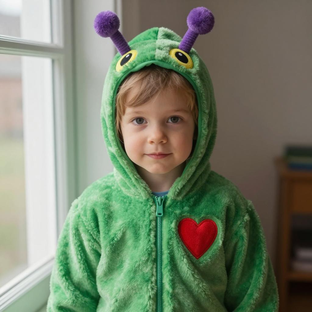 Hungry caterpillar costume, photograph of a young child with light brown hair, wearing a green hooded costume with purple antennae, yellow circles, and a red heart, standing indoors near a window, soft natural light, slightly blurred background, child looking directly at camera, innocent expression, casual indoor setting, child centered, colorful costume, daytime, medium close-up