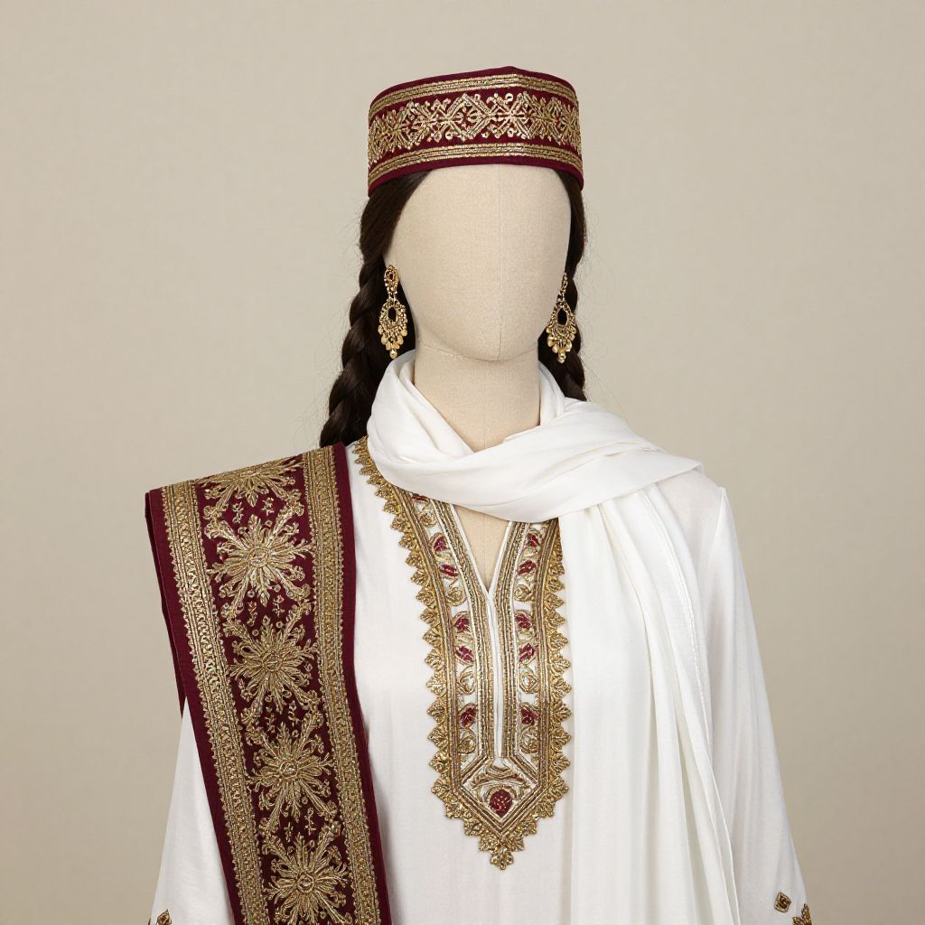 Photograph of a faceless mannequin wearing traditional Middle Eastern or South Asian attire. The outfit includes a white shalwar kameez with intricate gold embroidery along the neckline and a maroon and gold patterned border on the left side. The mannequin also wears a white scarf draped around its neck and a maroon and gold embroidered cap. Long black braids hang from either side of the mannequin's head, adorned with large, dangling gold earrings. The background is a plain, light beige color, emphasizing the detailed and colorful clothing. The overall style is elegant and richly decorated.