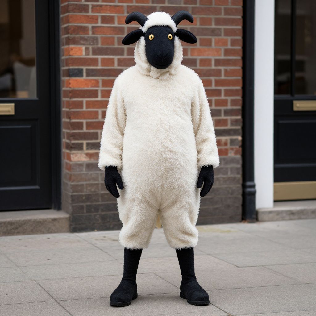 Shaun Sheep Costume Man, in a sheep costume standing on a sidewalk