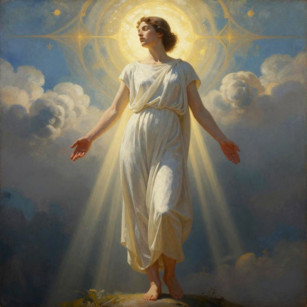 Digital painting of a fair-skinned woman with large white wings, wearing a flowing white dress, standing barefoot in a dark, abstract background with geometric