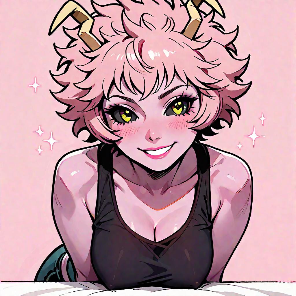 (score_9, score_8_up), score_7_up, zPDXL, ashido mina, pink skin, pink hair, horns, black sclera, yellow eyes, smile, looking at viewer, black tank top, covered nipples, pink background, blushing, upper body, leaning forward, greatm8 style
