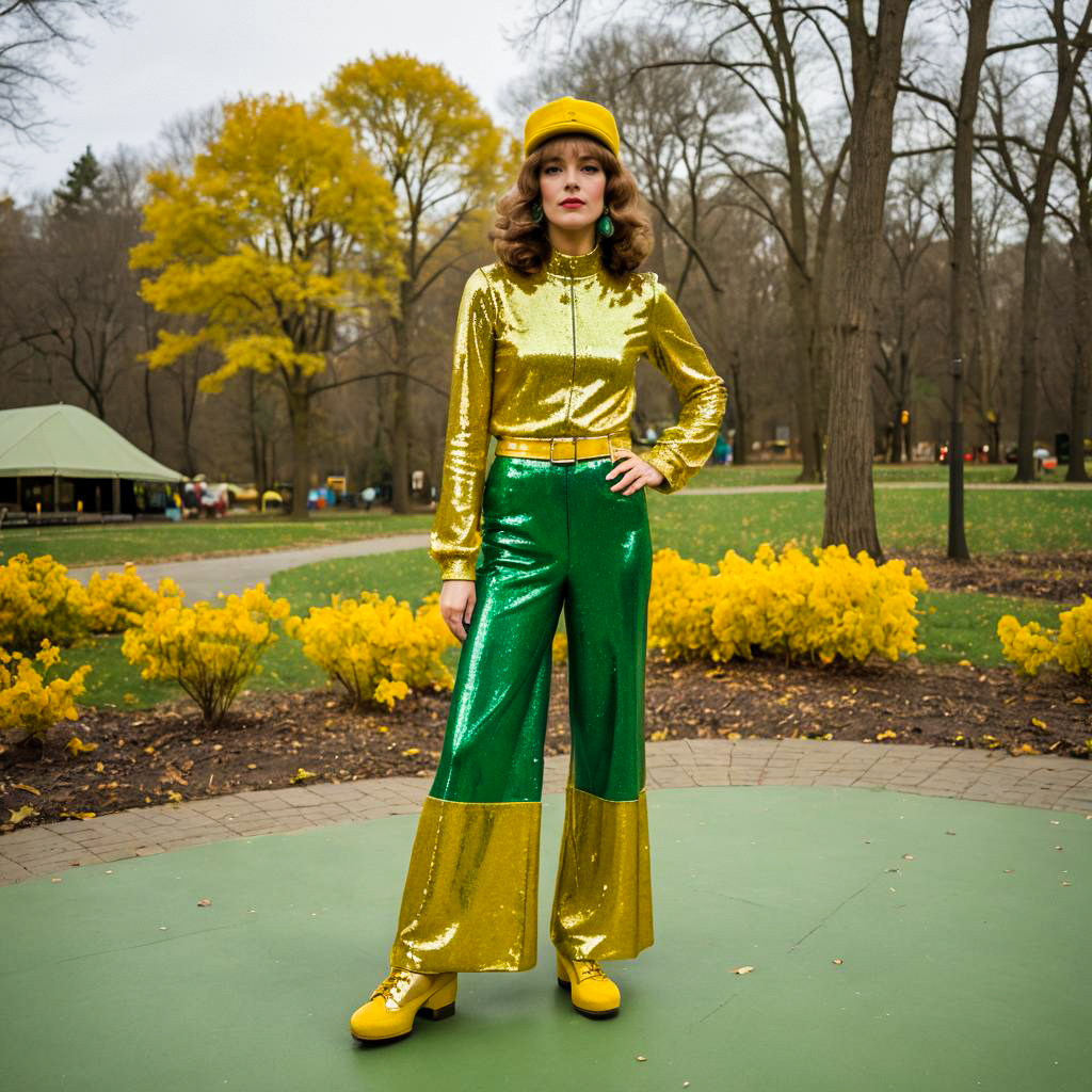 Young woman wearing a shiny green sequined jumpsuit with a matching belt and headband, paired with yellow platform shoes, standing confidently on a roller rink in an urban park during autumn. The outfit reflects 1970s fashion style with earthy green and yellow tones, complemented by fall foliage in the background.