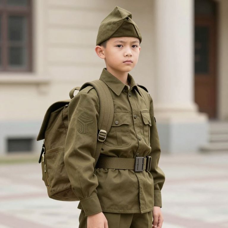 Military Fancy Dress, boy in uniform standing in front of a building with a backpack