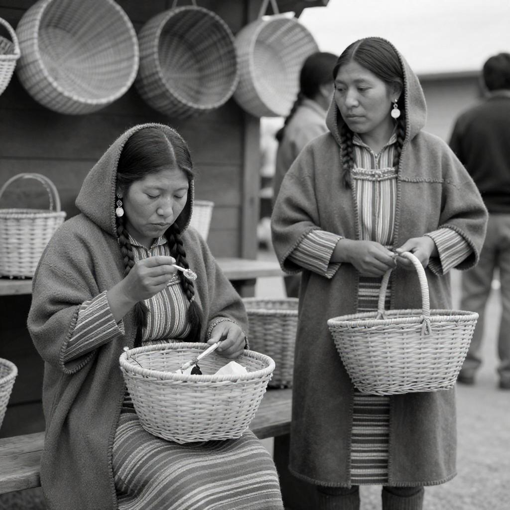Black-and-white photograph of four men on a small boat. One man in a plaid shirt and cap sits in the foreground, focused on fishing gear. Two men in dark clothing and a third in a striped hat assist behind him. The boat is on a calm body of water with a distant shoreline.