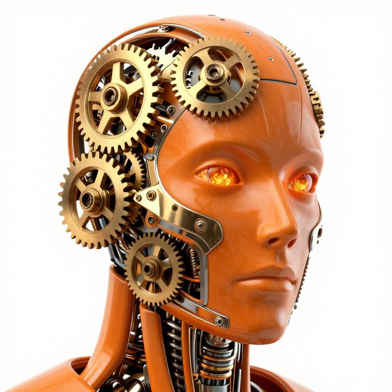 A highly detailed, featuring an orange-hued cyborg with a face constructed from intricate wheels, interlocking steampunk gears, and polished metal plates, The gears interconnect seamlessly, forming a symmetrical, mechanical visage with glowing amber eyes that radiate a faint, fiery light