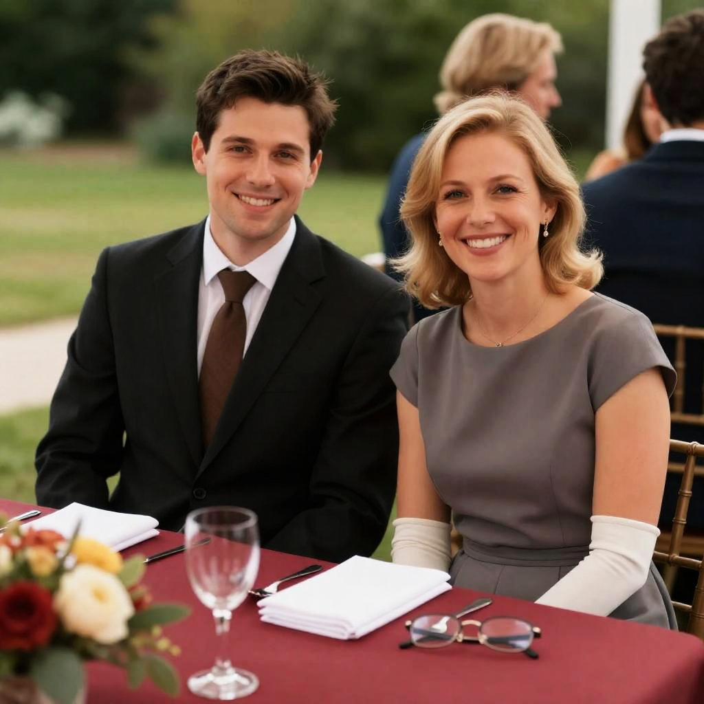 Photograph of a smiling couple seated at a red-clothed table. The man in a black suit with brown tie, the woman in a gray dress with white gloves. Glasses, folded napkins, floral centerpiece on table. Background with greenery, other guests. Man has short dark hair, woman has blonde hair. Clear, sunny outdoor setting.