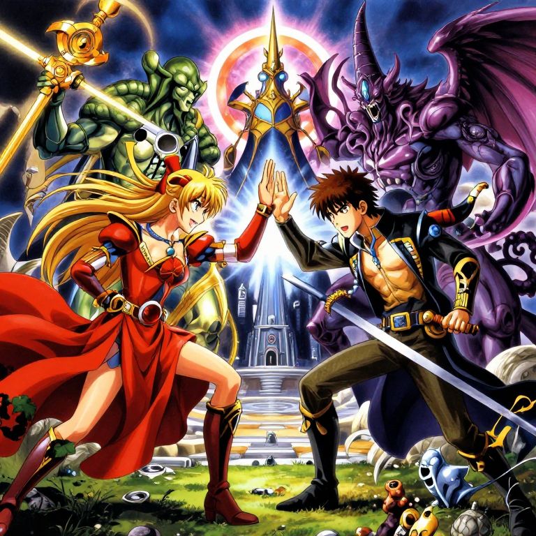 Vibrant anime-style battle scene: blonde woman in red dress, brown-haired man in military jacket, fighting green ogre, purple demon, with