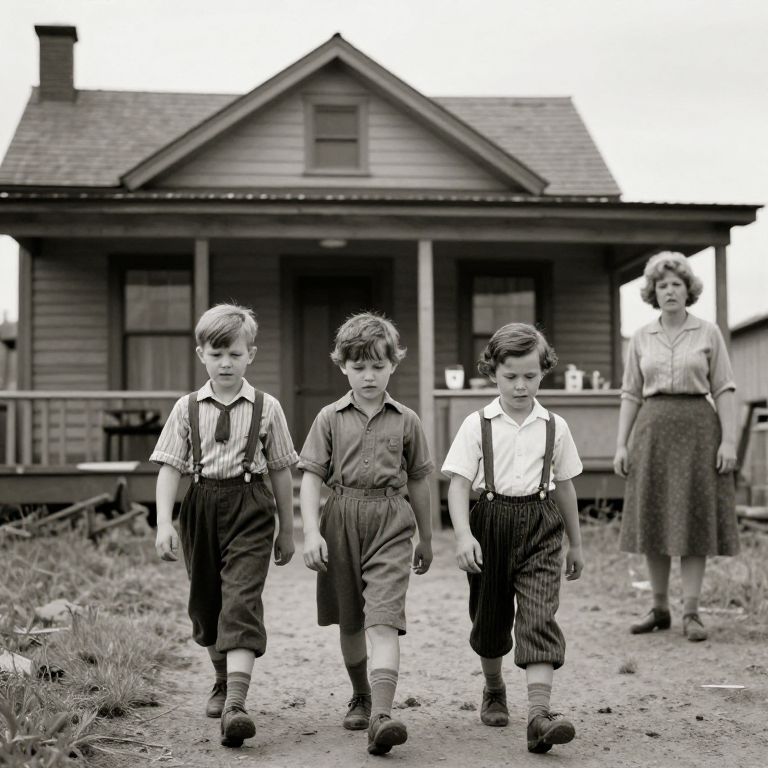 Expression 1920s coal mine kids walking into a 1970s house after a day at the mines, mom standing in the kitchen angry with them because of their dirty feet,
