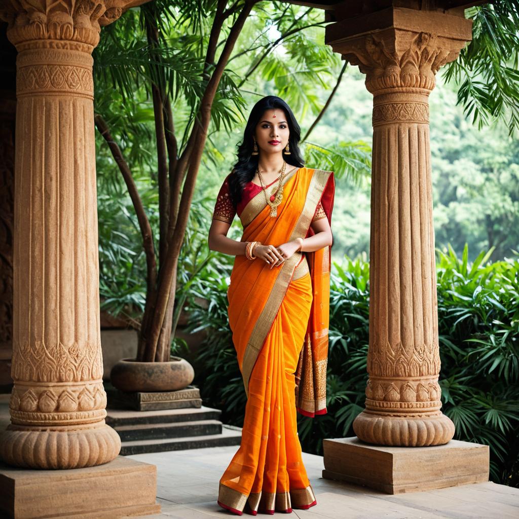 Indian Woman in Orange Saree Between Stone Pillars