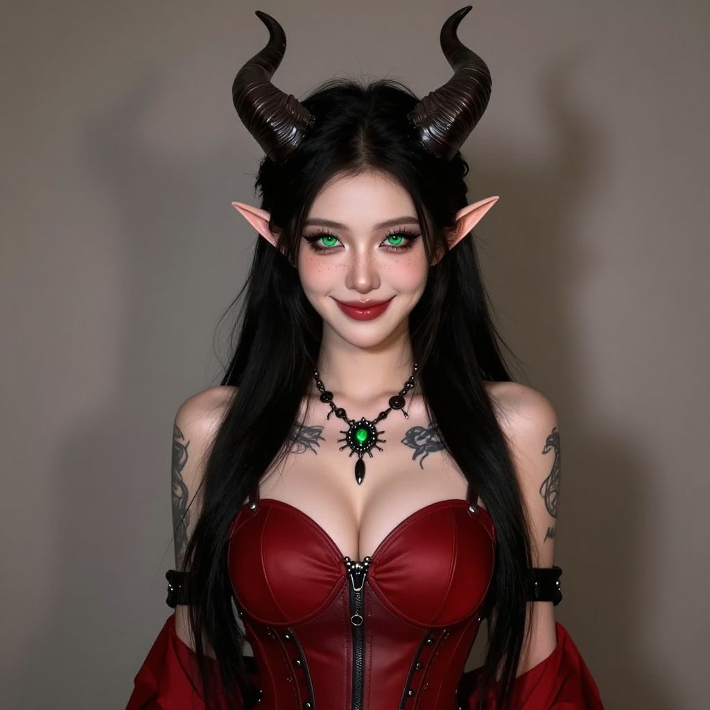 Photograph of a young woman with pale skin, green eyes, and long black hair. She wears black, curved horns and pointed elf-like ears. Her outfit is a tight, red leather corset with a front zipper, accentuating her large breasts. She has tattoos on both arms, a black necklace with a green gem, and black wristbands. She smiles subtly. The background is a plain, gray wall. The image has a digital, slightly surreal style, with vivid colors and sharp contrasts.