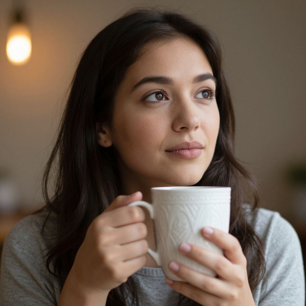 Thoughtful woman holding a white ceramic mug with intricate patterns, her gaze directed upward as she appears to savor the aroma, set against a softly lit background with warm bokeh lights.
