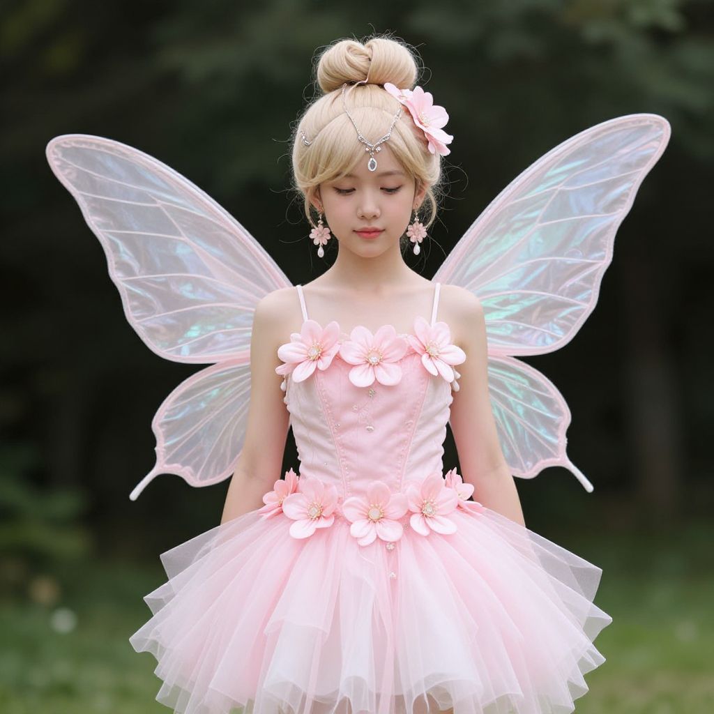 Photograph of a young Asian woman with fair skin, wearing a delicate, pale pink, fairy-inspired dress adorned with floral appliqués and a voluminous tulle skirt. She has blonde hair styled in an elegant bun, embellished with a pink flower and a jeweled headpiece. She has semi-transparent, iridescent fairy wings on her back and wears matching pink floral earrings. The background is a blurred, dark green forest, highlighting her ethereal appearance. Her expression is serene, and she stands with her arms gently by her sides, exuding a whimsical, fairy-tale charm.