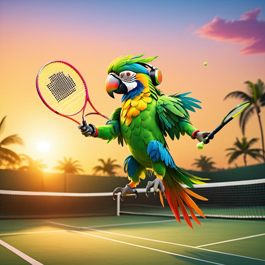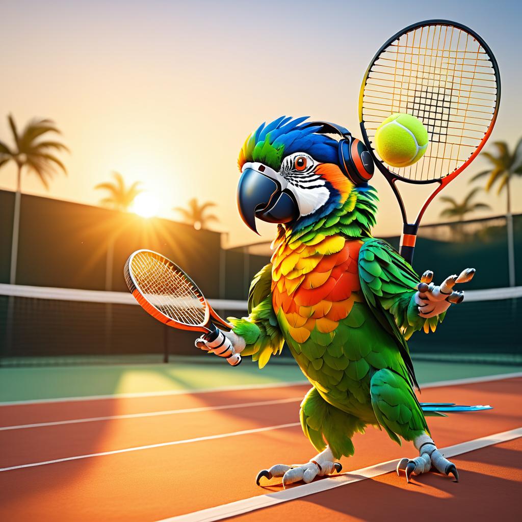A parrot wearing headphones playing tennis at sunset. The scene captures a playful atmosphere with dynamic action.