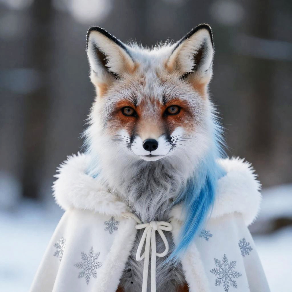Foxie european vixen, icy blue to white gradient hair, white woolen cape with silver embroidery, winter forest, Snowflake, natural skin texture, 4k textures, soft cinematic light, photolab, intricate, elegant, highly detailed, sharp focus, ((((cinematic look)))), soothing tones, intricate details, low contrast, exposure blend, hdr, faded, hyperdetailed, backlighting, cowboy shot, 85mm, close-up, sparkle, award winning, best quality, 4K