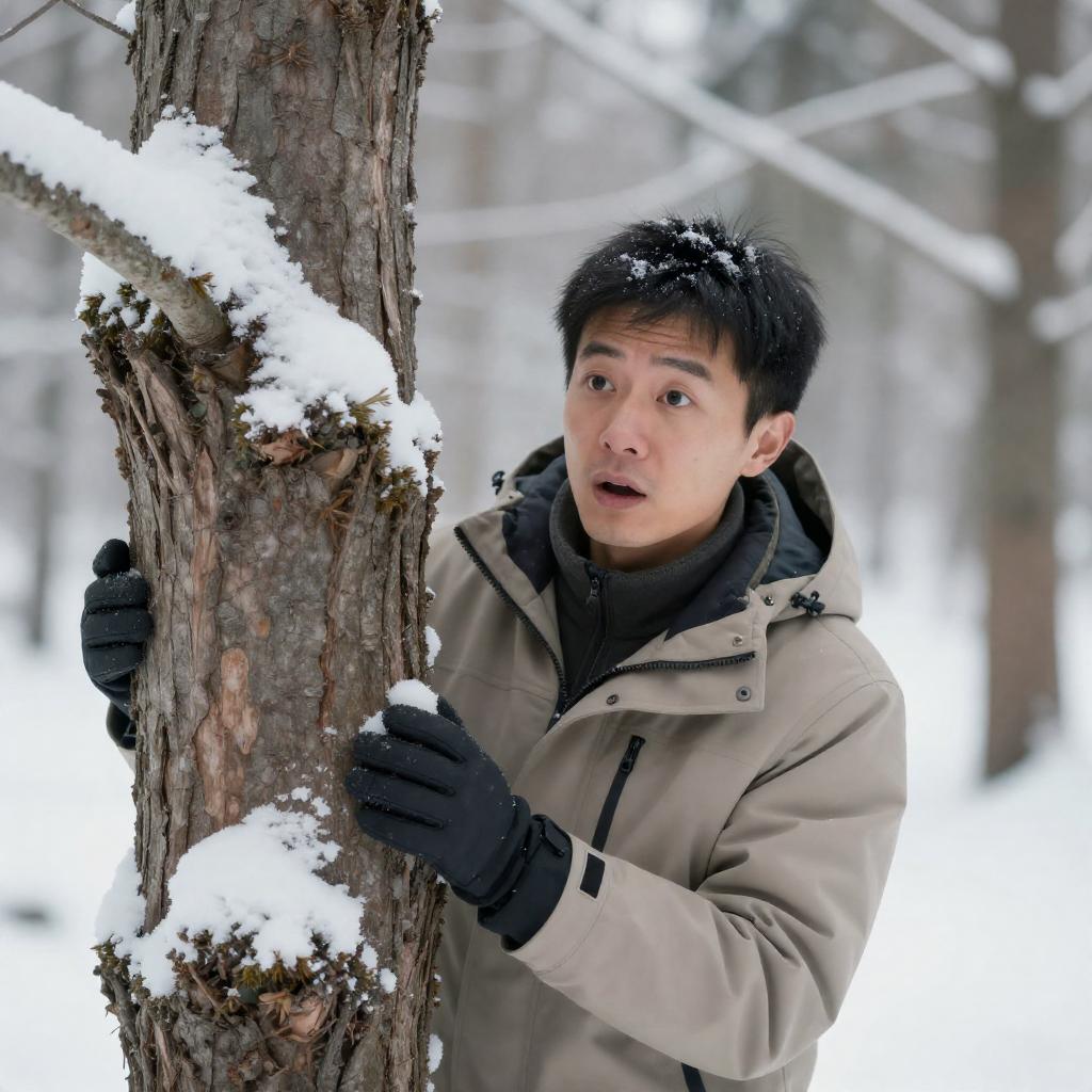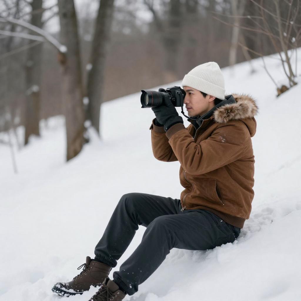 Photograph of a man in a brown fur-lined jacket and white beanie, sitting on a snowy hillside, holding a camera to his eye. He is looking through the viewfinder, surrounded by leafless trees and a white, snowy landscape. His dark pants and gloves contrast with the bright snow.
