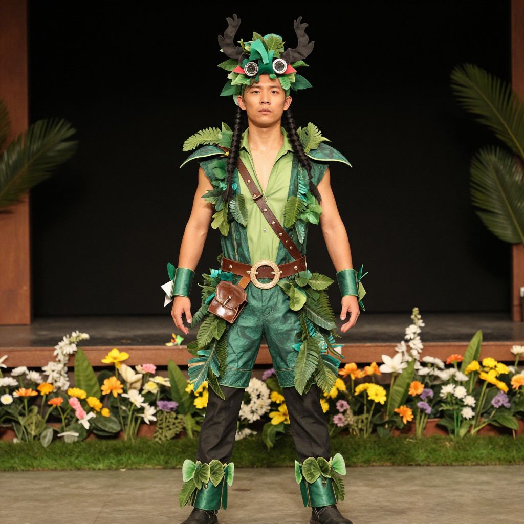 "Jungle Costume, man in a costume standing in front of a stage with flowers"