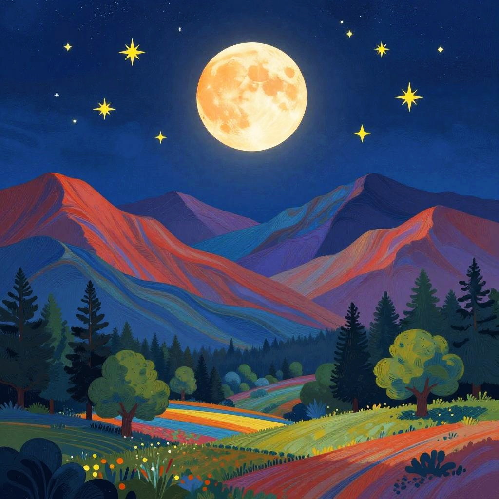 A vibrant, surreal painting featuring a large, glowing, human-like moon face with serene eyes at the center. Surrounding the moon is a cosmic backdrop with swirling blues and oranges. Bright red and orange trees with lush foliage frame the bottom, while a distant, misty landscape stretches out below. The moon's light illuminates the scene with a mystical glow.