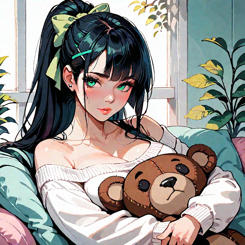 Score_9, score_8_up, score_7_up, one girl, solo, long hair, up ponytail, blunt bangs, green eyes, blush, large breasts, cleavage, narrow waist, bow, hair bow, hairclip, x hair ornament, sweater, long sleeves, bare shoulders, off shoulder, sleeves past wrists, holding stuffed toy, looking at viewer, object hug, stuffed toy, stuffed animal, teddy bear, upper body