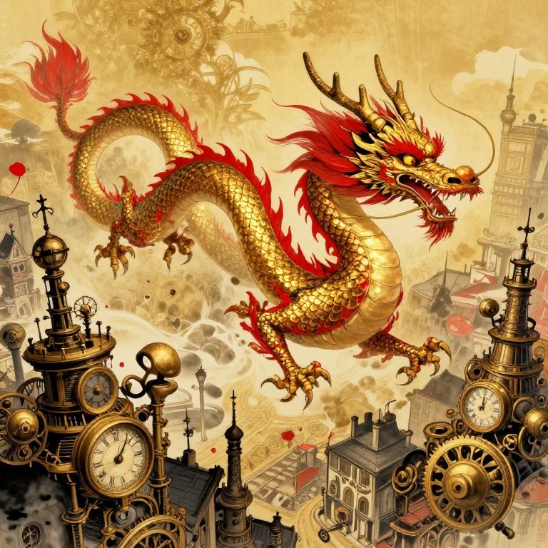 A vivid digital art composition showcases a surreal amalgamation of Japanese ink painting techniques and steampunk elements. The artwork features an awe-inspiring dragon with shimmering scales gracefully soaring through a dynamic Victorian-era cityscape brimming with intricate clockwork mechanisms. From an aerial viewpoint, the scene unveils the captivating interplay between nature's allure and industrial innovation as they harmoniously coexist in a mesmerizing dance. Dominant hues of gold and crimson paint the canvas, exuding a sense of exhilaration and marvel while emphasizing the delicate equilibrium between disorder and order within this imaginative realm.