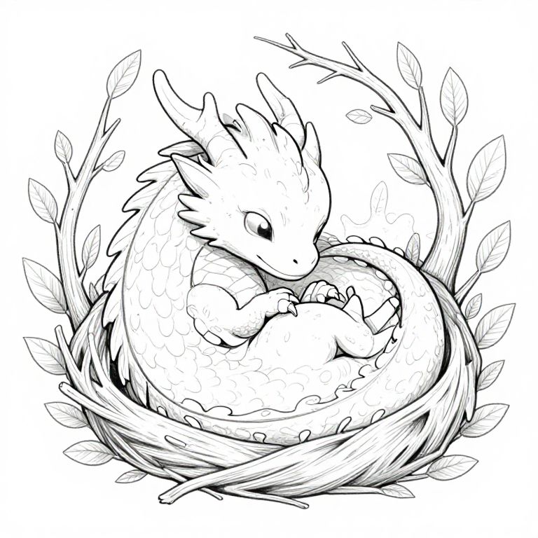 Dragon lineart drawing of a baby dragon curled up in a nest, soft and flowing lines to show gentle features and small claws, surrounded by detailed branches and leaves in fine ink strokes, emphasizing a tender and magical feel in monochrome.