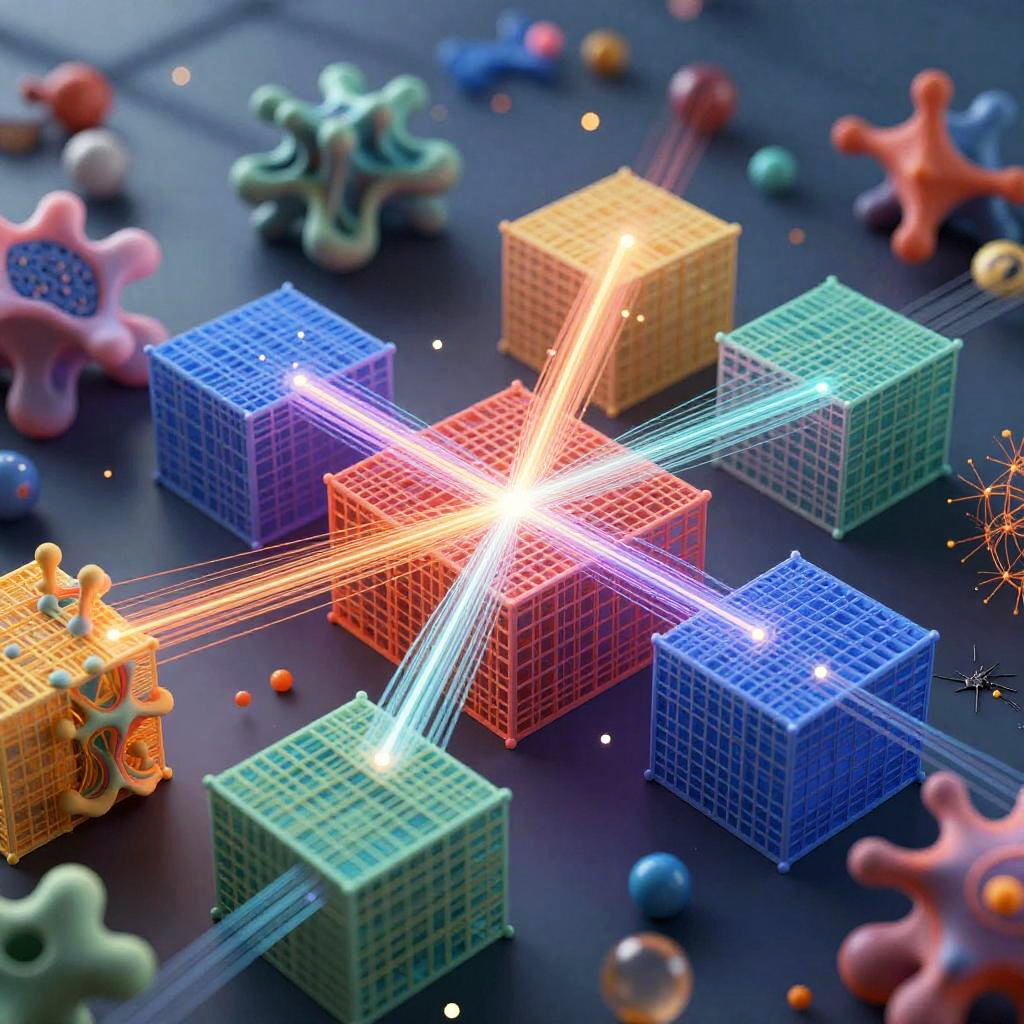 Tensor.art visualization of complex tensors in a surreal landscape, colorful multidimensional grids intersecting with fluid organic forms, luminous lines and nodes connecting in 3D space, evoking advanced technology and digital creativity, high resolution
