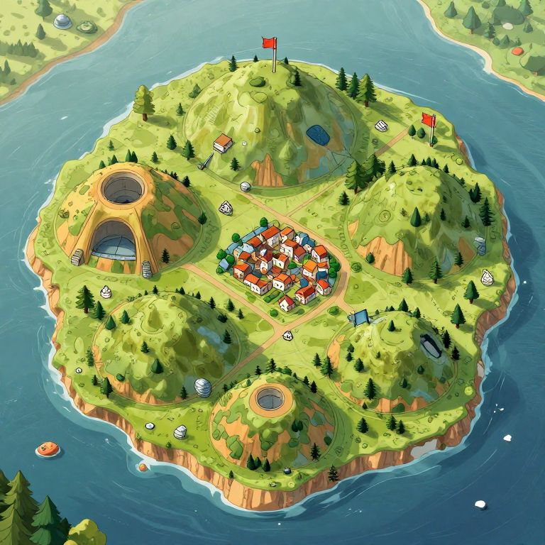Island /imagine map diagram, pen and paper, a series of drawn hills, mines, a village, forest, and adventure icons, wide aerial shot from above,