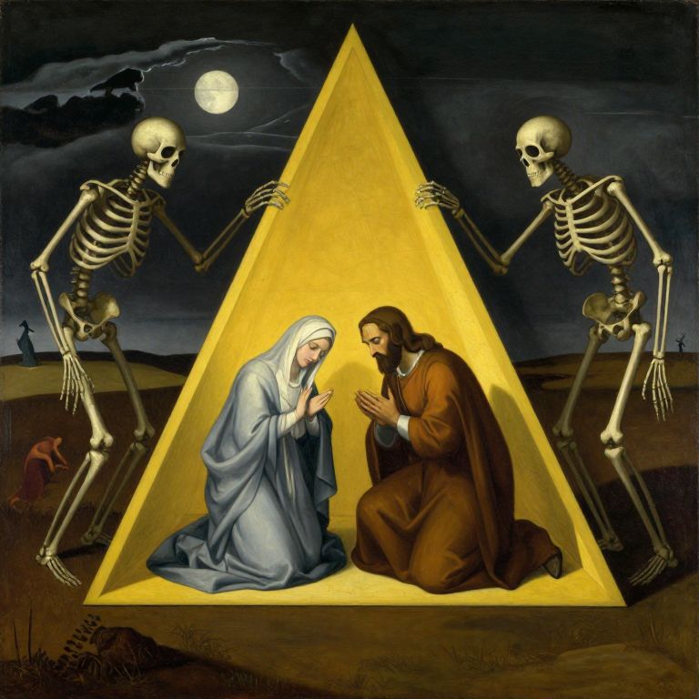 Surreal Nativity with Skeletal Figures