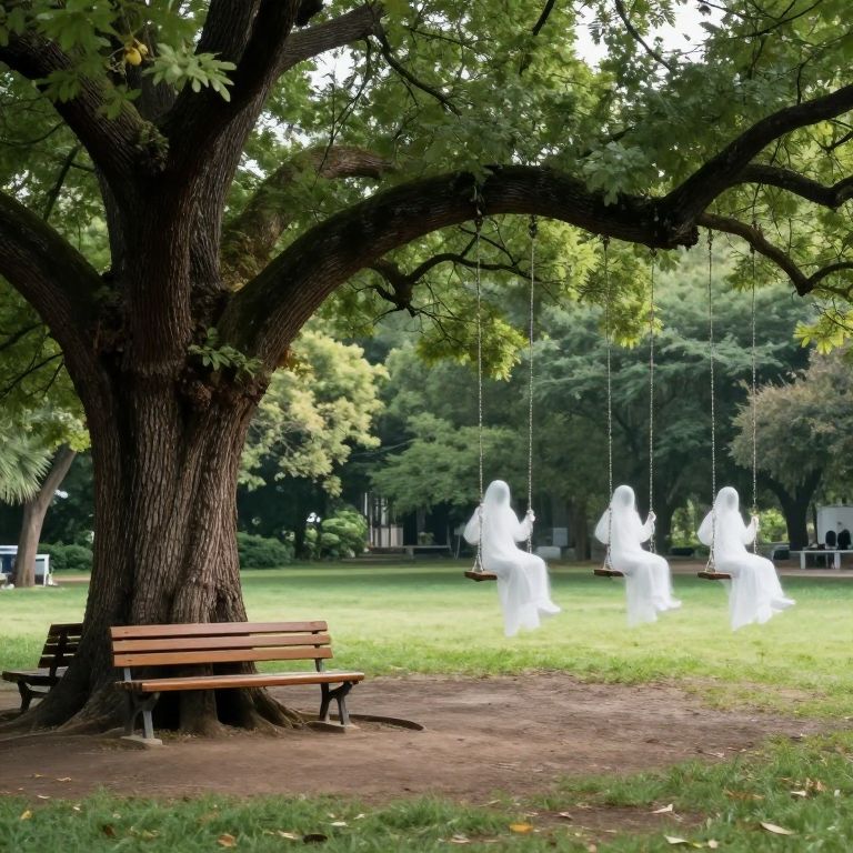 Photograph of a park with a large tree, wooden bench, and four white ghostly figures swinging on ropes in the background.