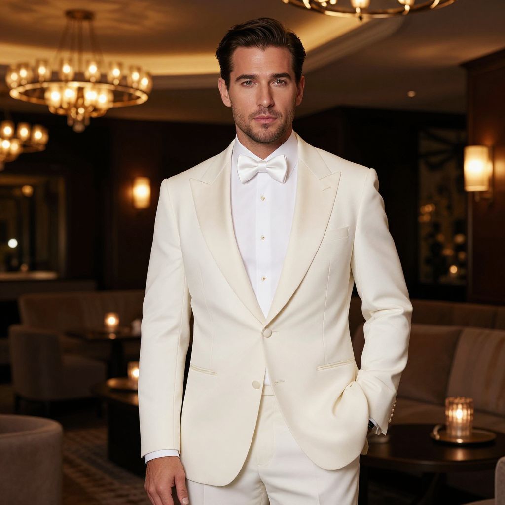 A stylish man in a sophisticated white tuxedo with a bow tie stands confidently in a dimly lit lounge filled with ambiance. The elegant decor features warm lighting and circular chandeliers, creating a glamorous atmosphere ideal for an upscale event.