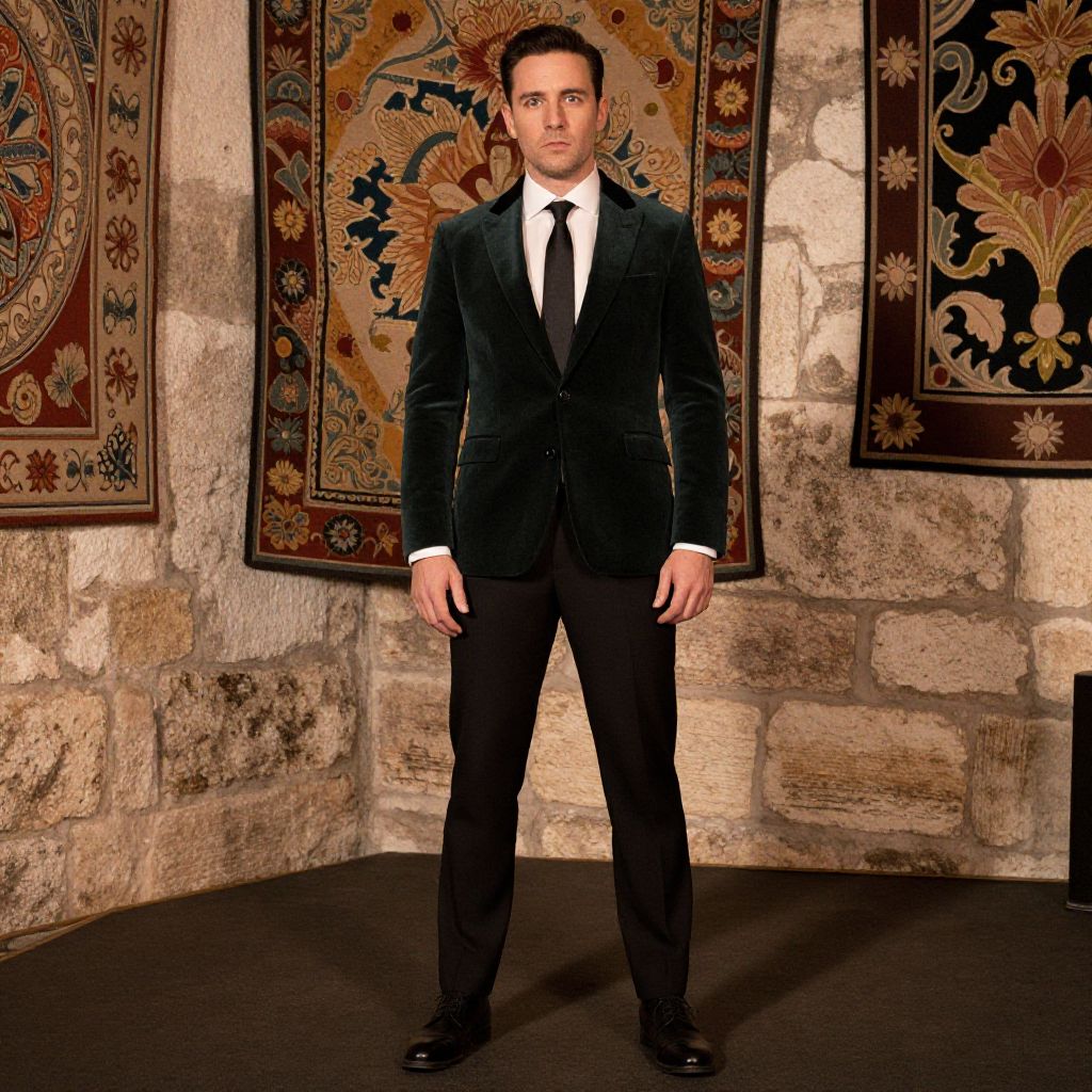 A man, dark green velvet blazer, off-white dress shirt, black tailored trousers, polished black oxford shoes, solid black tie, rustic stone walls, colorful tapestries hanging, intimate stage for performances, sepia effect, confident expression. Man has masculine face and piercing eyes