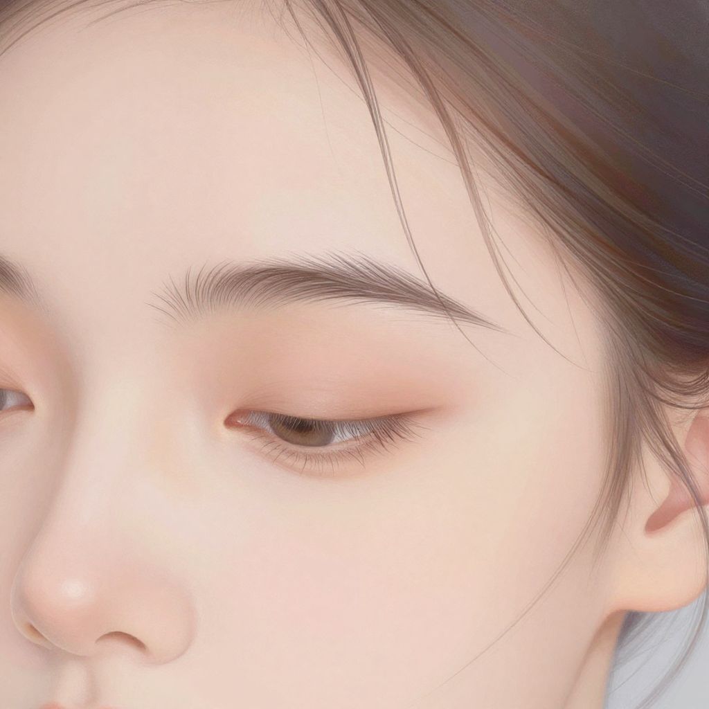 An artistic rendering of a face with wispy eyebrows, hyper-realistic digital painting style, emphasis on soft textures and gentle color gradients, light flowing hair strands blending with eyebrow hairs, tranquil mood with muted pastel background, beauty and elegance theme.