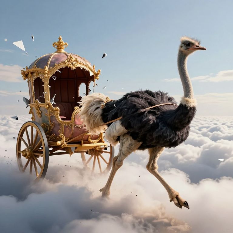 A regal, six-legged ostrich in royal robes gallops across a sea of clouds, pulling a chariot built from shattered mirages and half-remembered dreams.