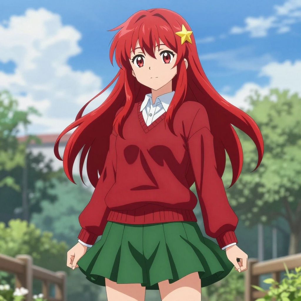 Anime-style digital drawing of a red-haired girl with blue eyes, wearing a red sweater, white shirt, and green skirt, standing on a sunny,