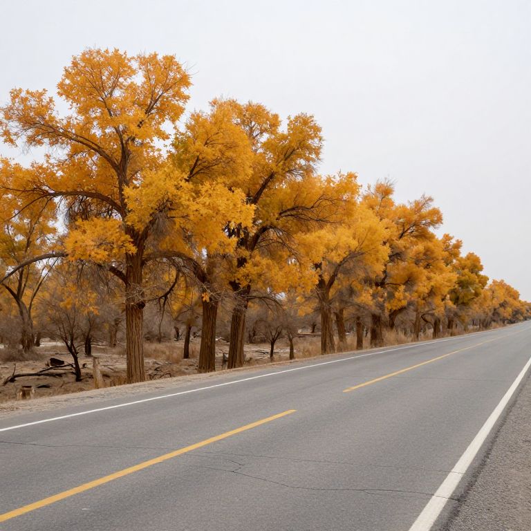 Solemn trees stand sentinel along a desolate highway, their golden leaves whispering tales of resilience amidst the cracked concrete, evoking a poignant blend of solitude and enduring hope.