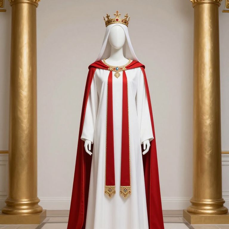 Mannequin wearing a white robe with red accents and a crown on his head. He is standing in a room with gold pillars and a white wall.
